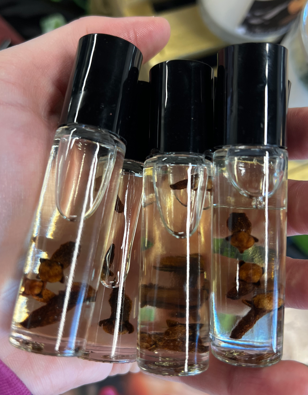(Roller Bottle) Castor oil, sweet almond oil, safflower oil, peppermint, eucalyptus & frankincense essential oils, infused with cloves