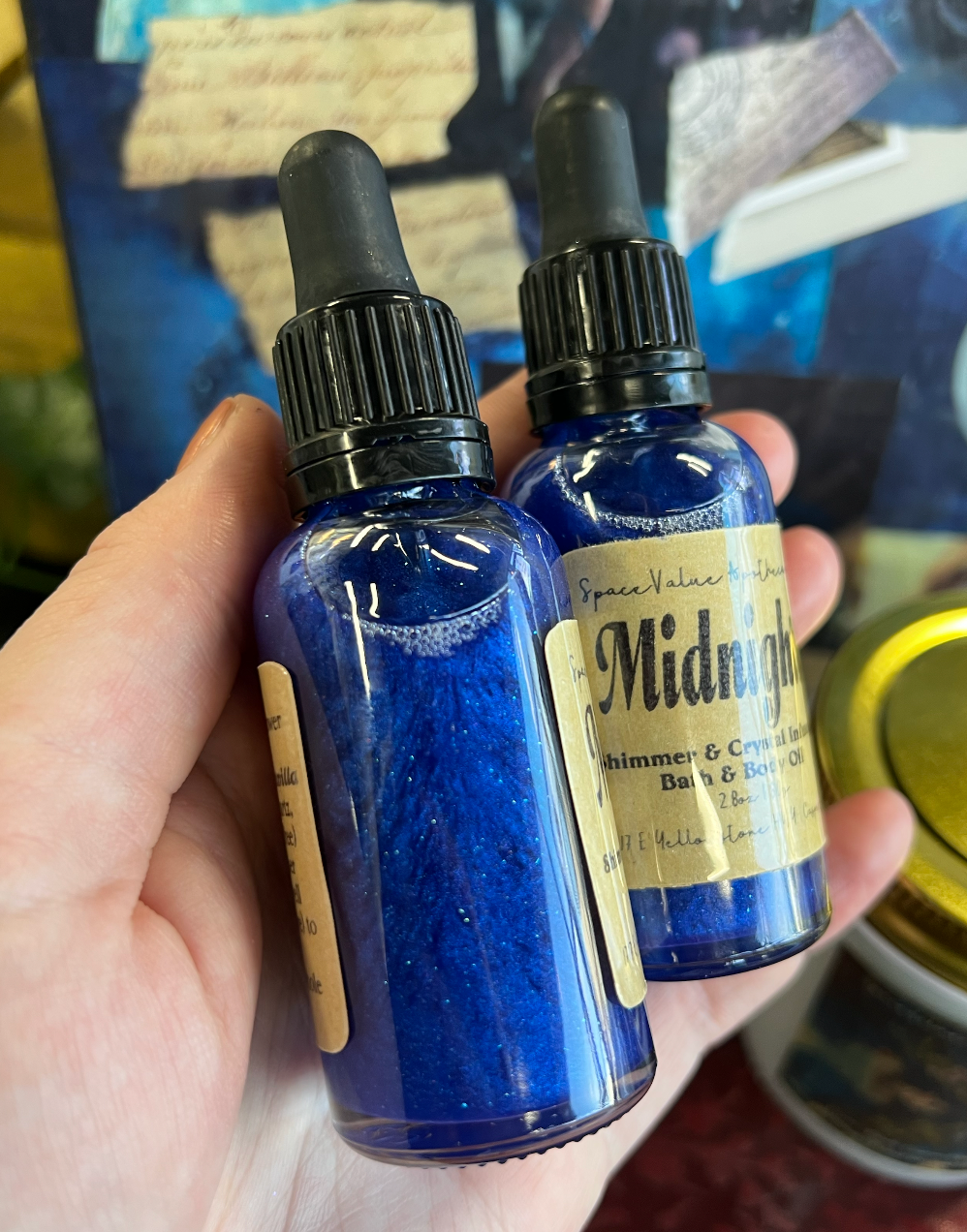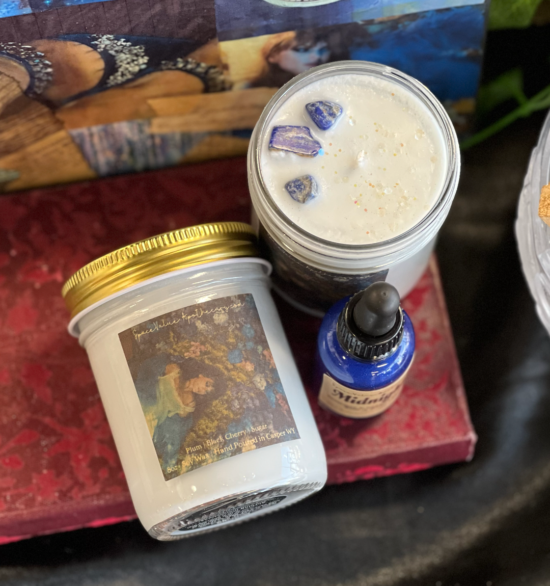 Midnights Bath & Body Oil | Sweet almond oil, safflower oil, mineral oil, fragrance oil, blue shimmer & lapis crystals | Apply directly to skin or add to warm bath water for extra shimmer, hydration & magick