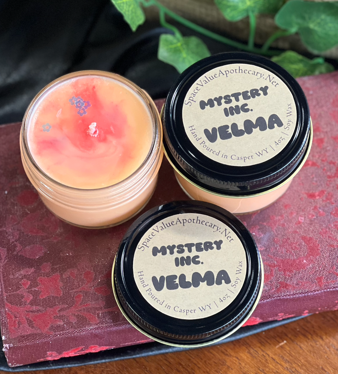 Velma | Melts shimmery orange & red, topped off with flower biodegradable glitter. Scented with orange peel, apple, tonka bean + notes of vanilla & clove