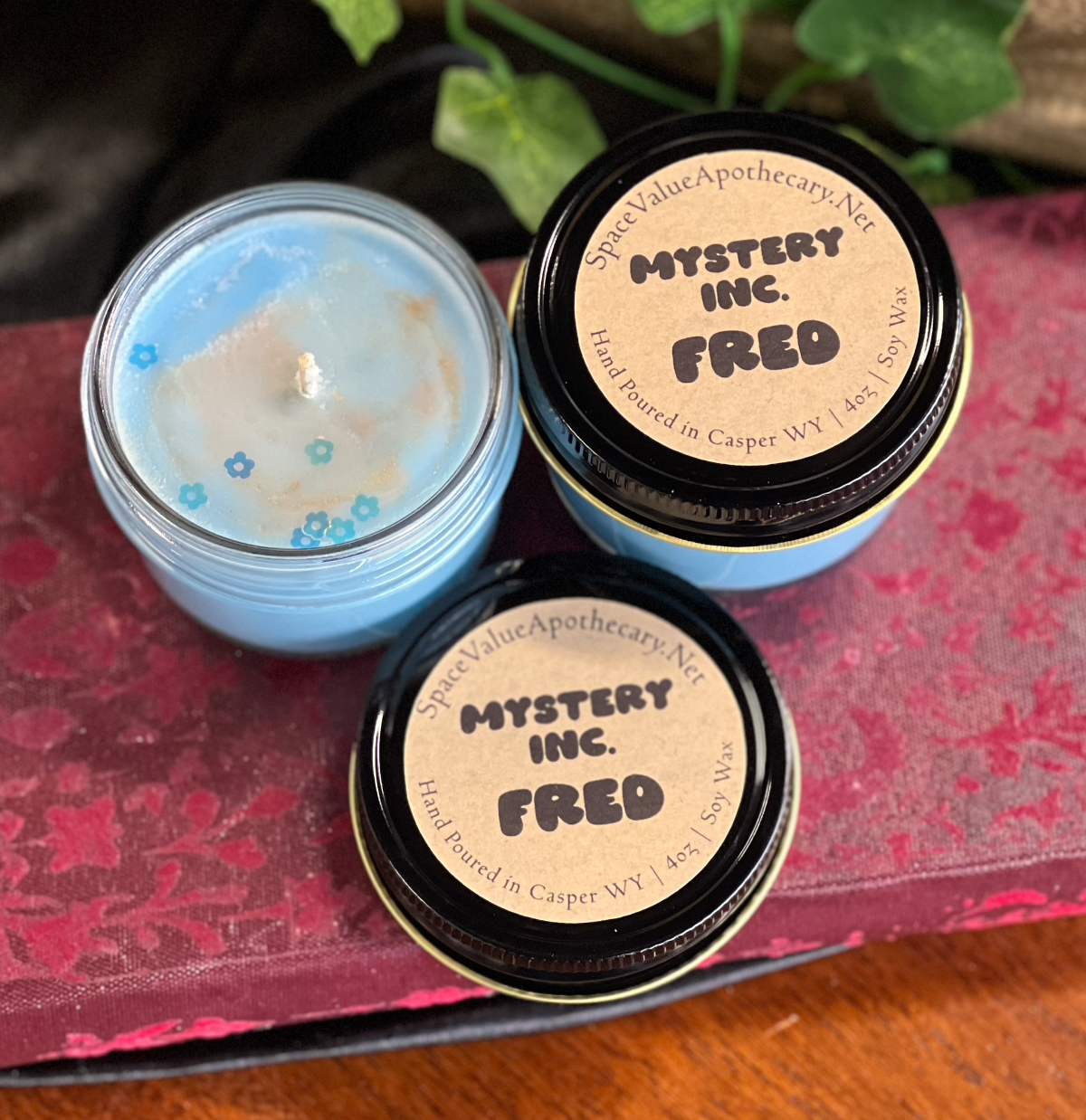 Fred | Melts shimmery blue & gold, topped off with flower biodegradable glitter, Scented with dark musk, vetiver, amber + notes of cinnamon & honey