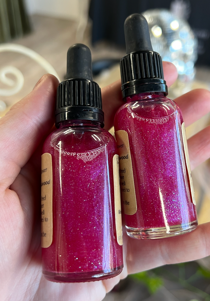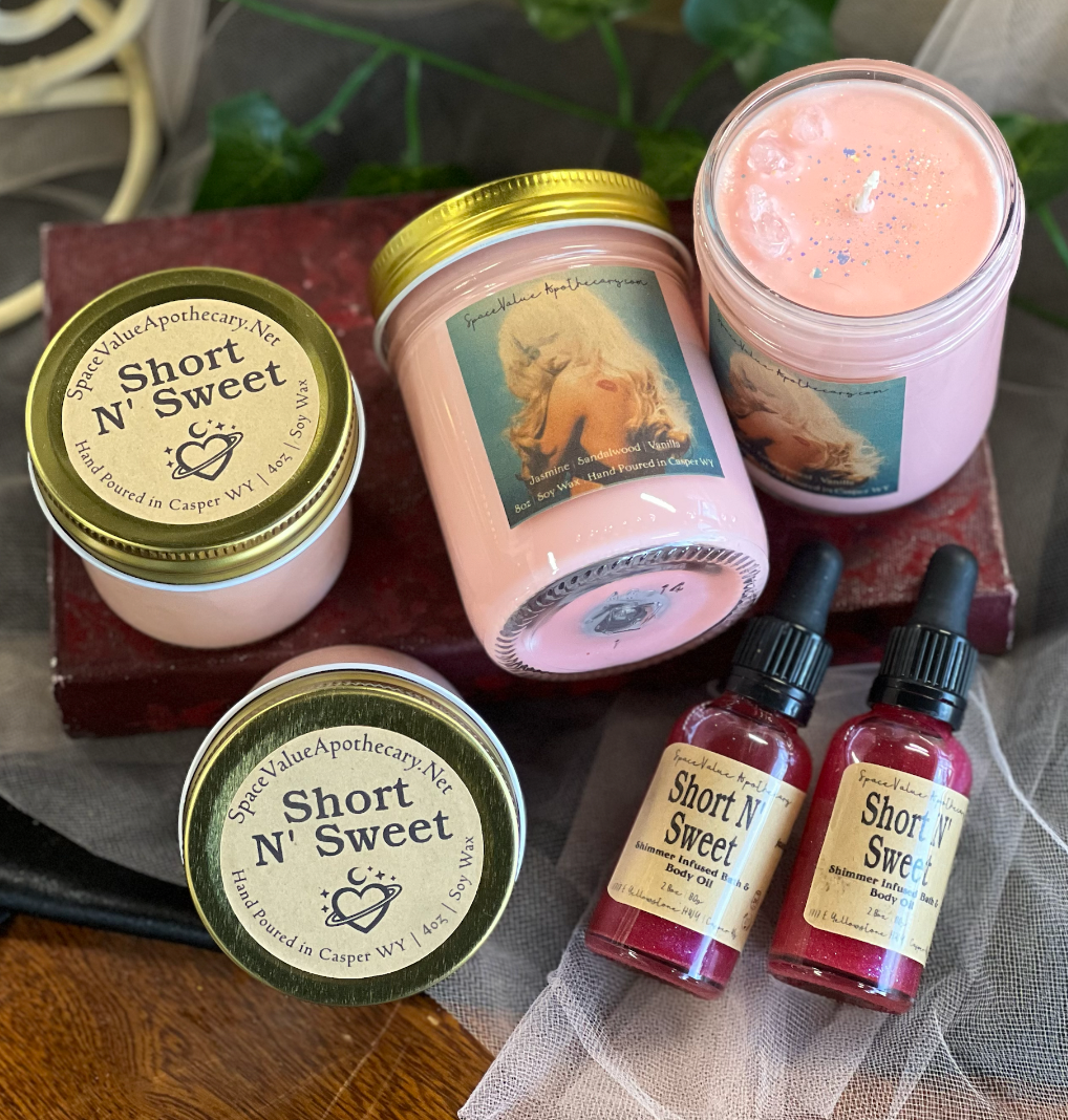 Short N' Sweet Bath & Body Oil | Sweet almond oil, safflower oil, mineral oil, fragrance oil, pink shimmer | Apply directly to skin or add to warm bath water for extra shimmer, hydration & magick