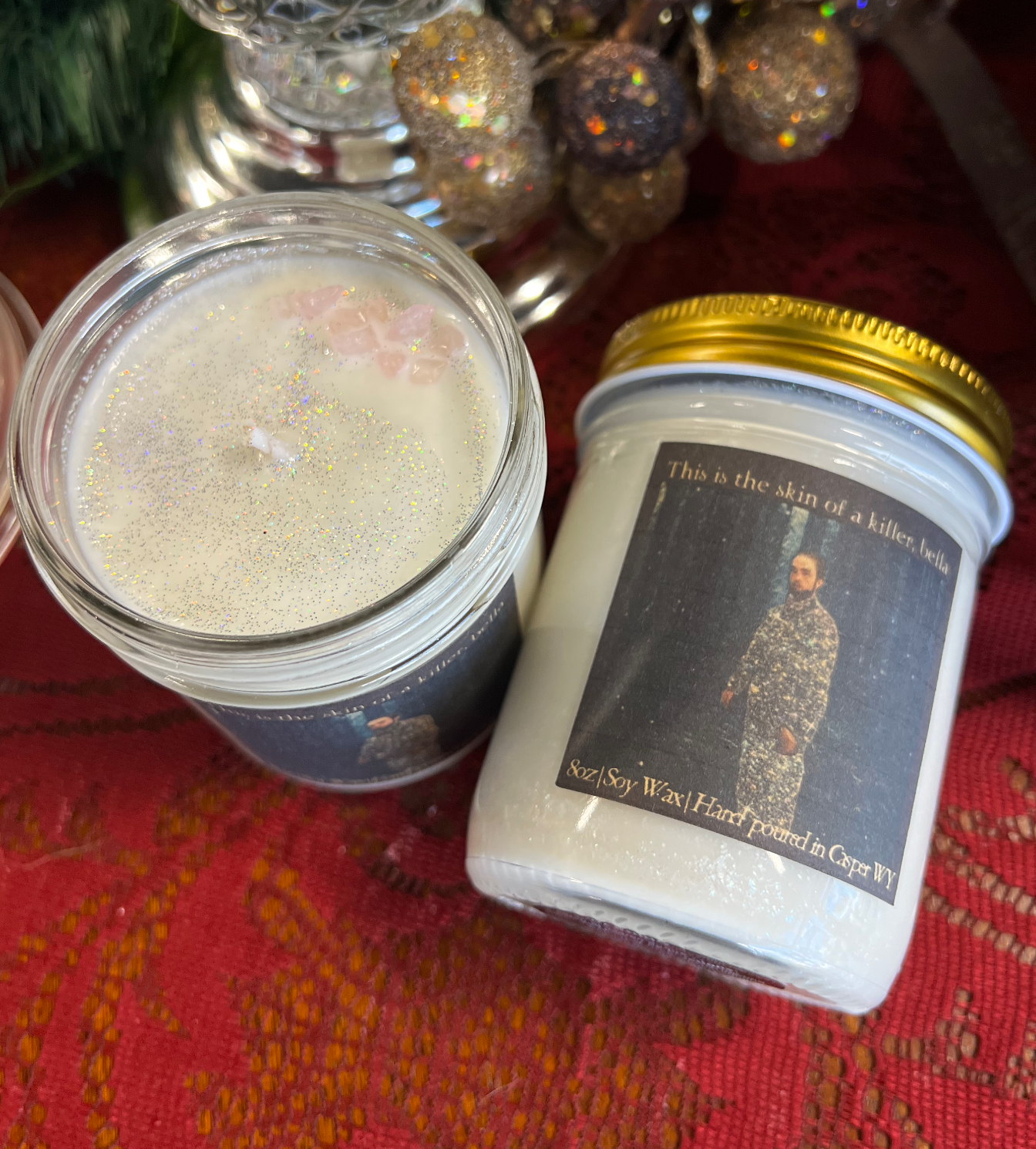 Edward 8oz Candle | Soy wax | Infused with pearl/silver shimmer | Scented with cedar & sandalwood, topped off with holographic biodegradable glitter & rose quartz crystals