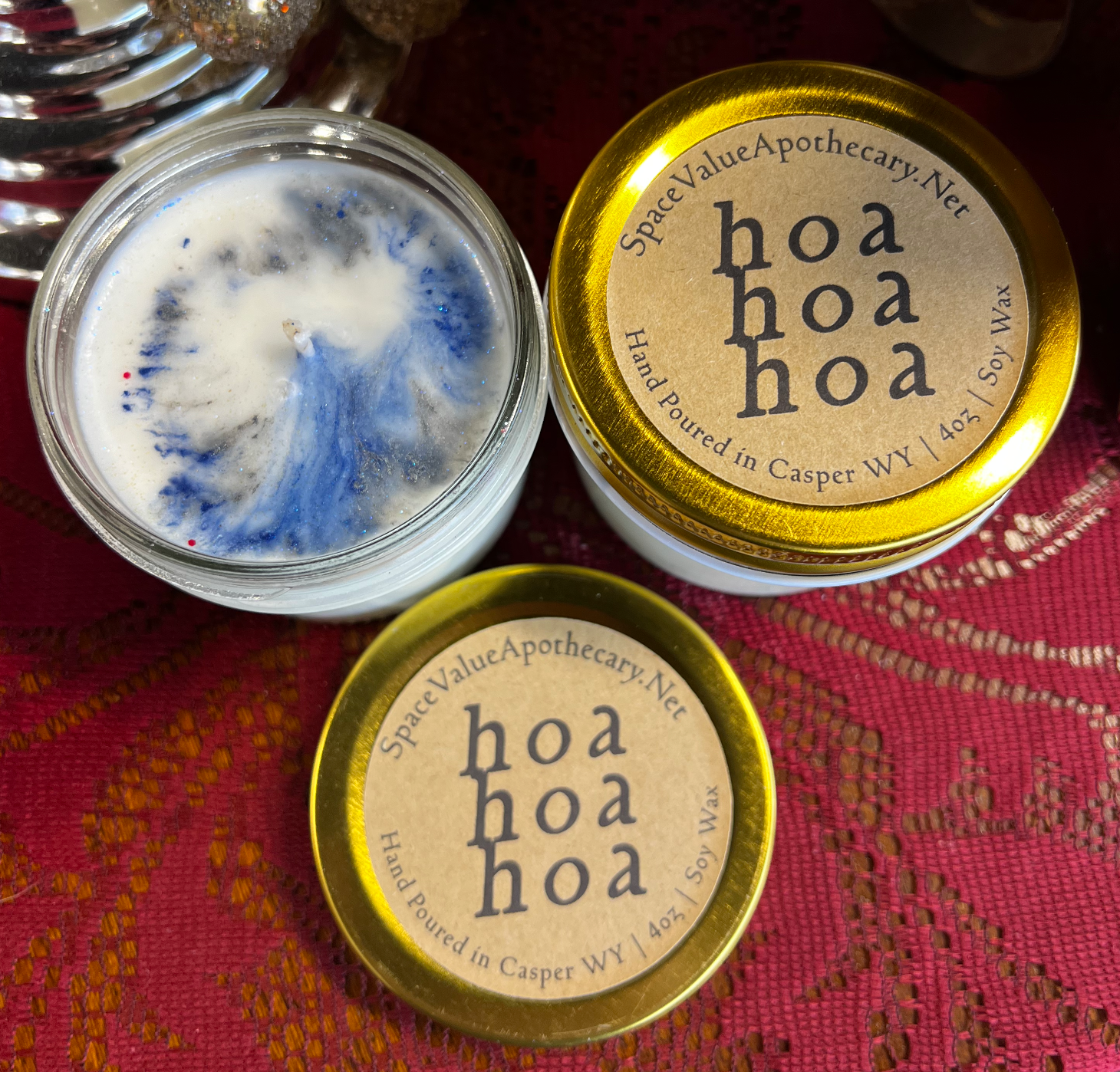 Hoa Hoa Hoa 4oz Candle | Soy wax | Scented with cedar, spruce & pine, topped off with dark blue & silver shimmer + blue/white tinted biodegradable glitter